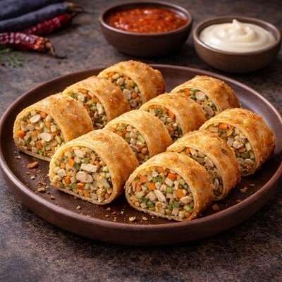 Crispy golden rolls stuffed with spiced mixed vegetables, deep-fried to golden perfection.